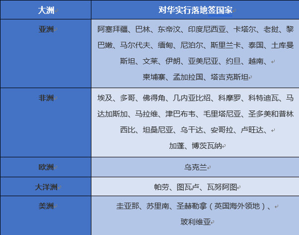 另有马尔代夫、文莱、科摩罗、帕劳、缅甸、东帝汶、巴林、约旦、阿联酋、老挝、黎巴嫩、尼泊尔、斯里兰卡、泰国、土库曼斯坦、伊朗、越南、埃 及、多哥、佛得角、几内亚比绍、科特迪瓦、马达加斯加、马拉维、塞拉利昂、坦桑尼亚、乌干达、圭亚那、英属圣赫勒拿、图瓦卢、瓦努阿图、柬埔寨、孟加拉 国、毛里塔尼亚等34个国家(地区)单方面允许符合条件的持普通护照的中国公民抵达入境口岸时办理落地签证。