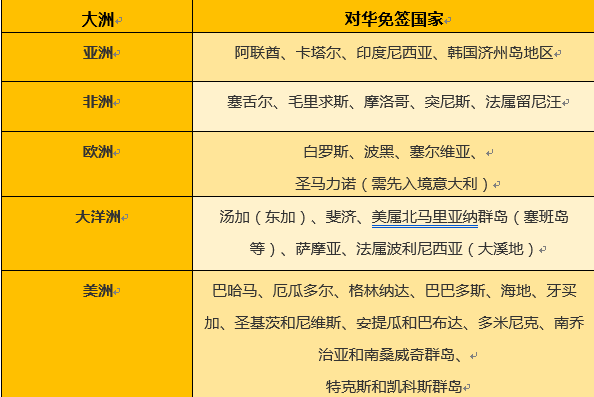 包括萨摩亚、海地、牙买加、多米尼克、安提瓜和巴布达、印度尼西亚、韩国济州道地区、美属北马里亚纳群岛联邦(塞班岛)、英属特克斯和凯科斯群岛、英属南乔治亚和南桑威奇群岛在内的10个国家(地区)对持普通护照的中国公民单方面免签。
